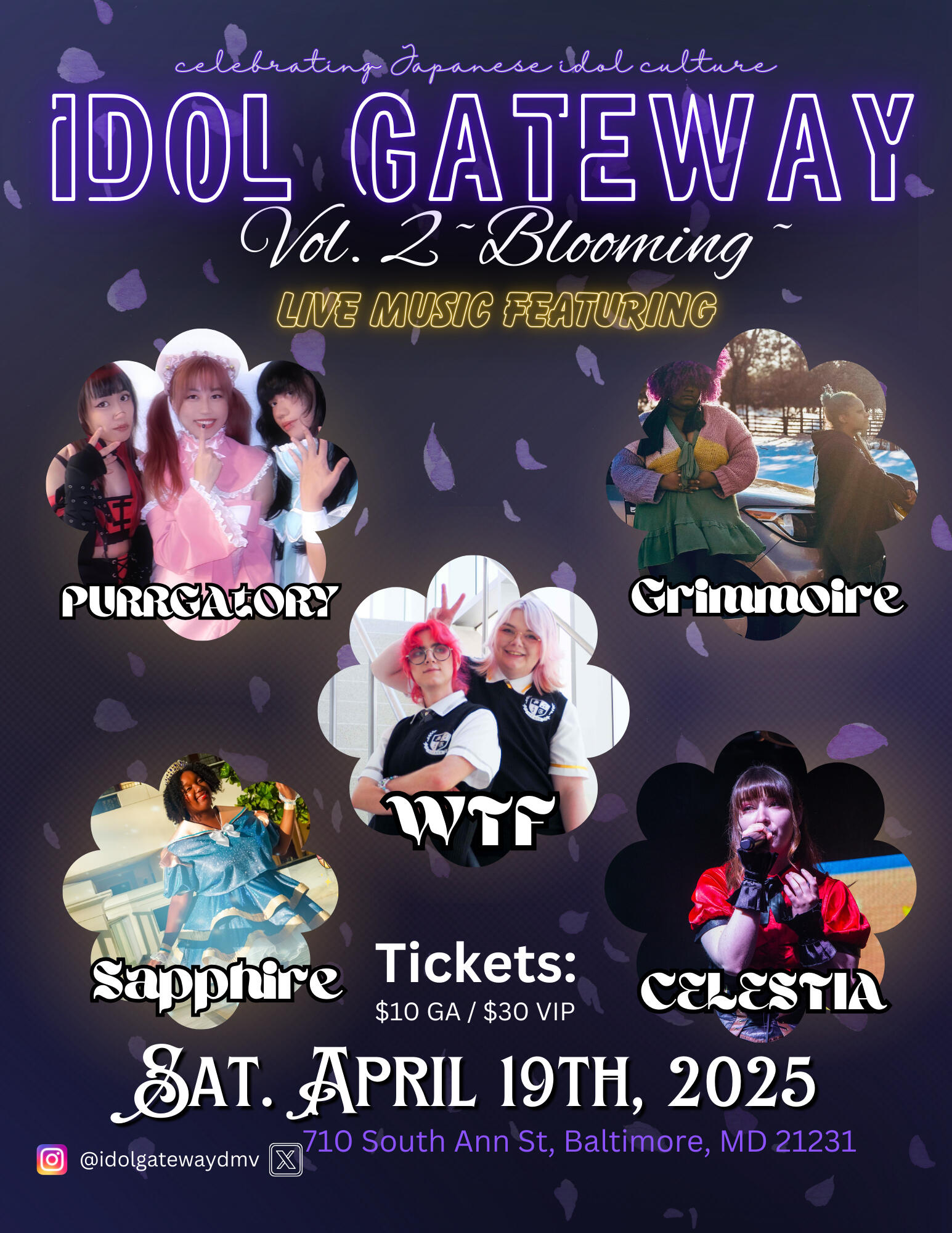 IDOL GATEWAY is a seasonal event hosted by local music artists whose goal is to hold live events inspired by Japanese idol culture such as 'taibans' (lit. translation "battle of the bands") showcasing many artists at one event with a dedicated merch and talk time after the performances. We want to be your gateway into learning more about idols!